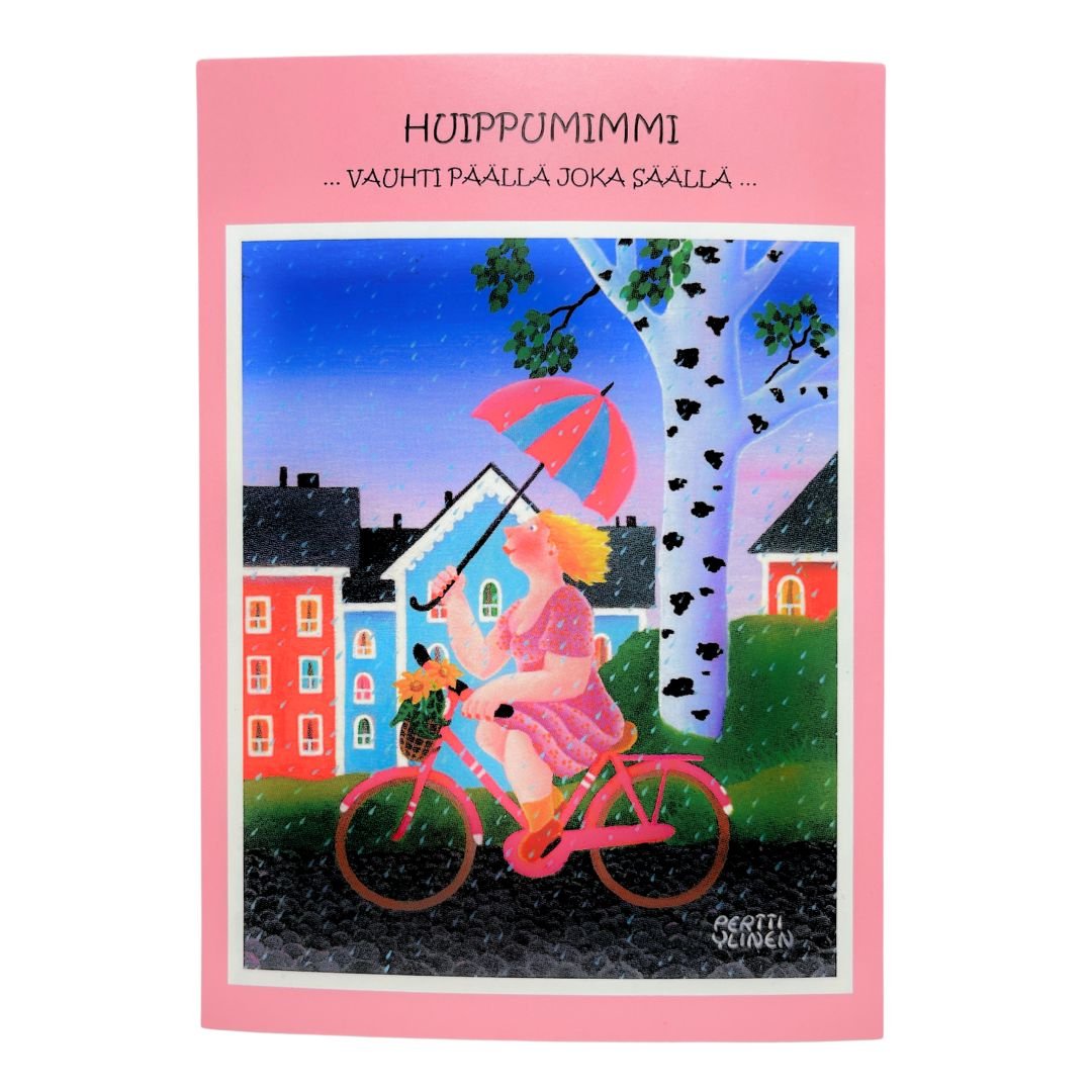 Kotimainen Vilippus-kortti ilahduttaa huippumimmiä. Taiteilija Pertti Ylinen on luonut kortin vauhdikkaan kuvituksen pyöräilevästä naisesta. Teksti ”Huippumimmi – vauhti päällä joka säällä” ilahduttaa vauhdikasta naista. Ilahduta huippumimmiä postikortilla tai anna hauska kortti lahjan kyljessä.