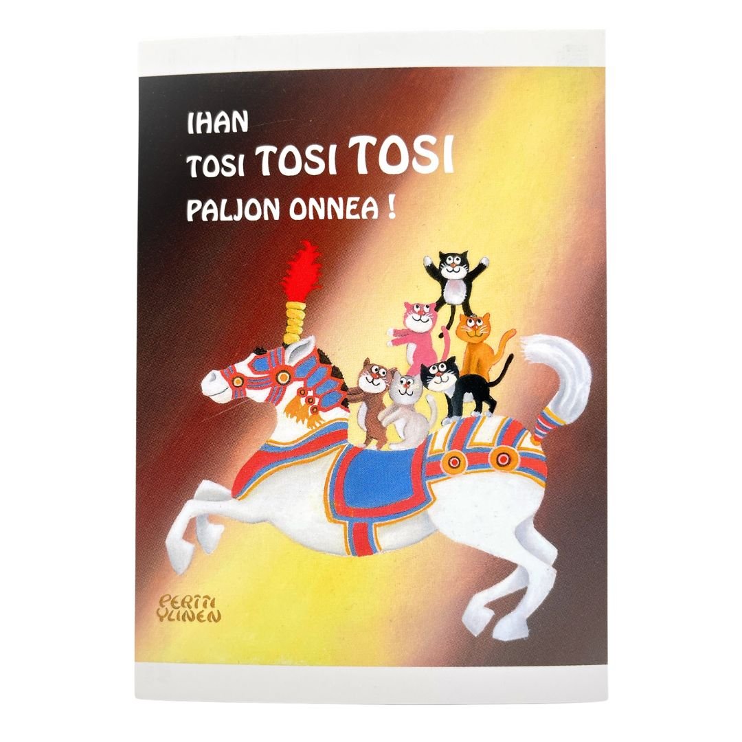 Kotimainen Vilippus-kortti onnittelee päivänsankaria veikeästi. Taiteilija Pertti Ylinen on luonut kortin hauskan kuvituksen sirkushevosella ratsastavista kissoista. Teksti ”Ihan tosi tosi tosi paljon onnea!” on monipuolinen onnentoivotus erilaisiin tilanteisiin. Lähetä hauskat onnittelut postikortilla tai anna veikeä kortti lahjan kyljessä.