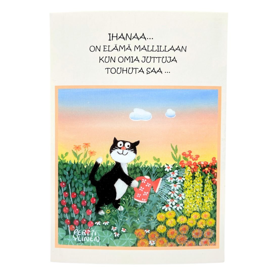 Kotimainen Vilippus-kortti toimittaa tervehdyksen leppoisiin hetkiin. Taiteilija Pertti Ylinen on luonut kortin hauskan kuvituksen puutarhaa hoitavasta kissasta. Teksti ”Ihanaa, on elämä mallillaan kun omia juttuja touhuta saa” kehottaa pitämään kiinni omista jutuista. Lähetä hauskat tervvehdykset postikortilla tai anna veikeä kortti lahjan kyljessä.