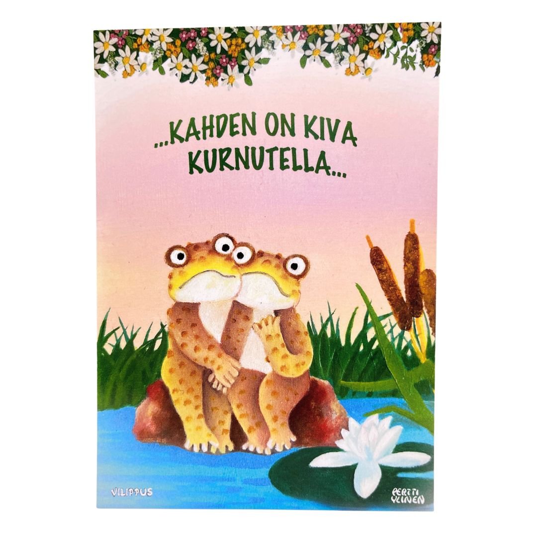 Kotimainen Vilippus-kortti kertoo kullalle kuinka kiva hänen kanssaan on kurnutella. Taiteilija Pertti Ylinen on luonut kortin hauskan kuvituksen kuhertelevista sammakoista. Teksti ”Kahden on kiva kurnutella” on veikeä tervehdys omalle kurnuttelukaverille. Lähetä hauskat tervehdykset postikortilla tai anna veikeä kortti lahjan kyljessä.