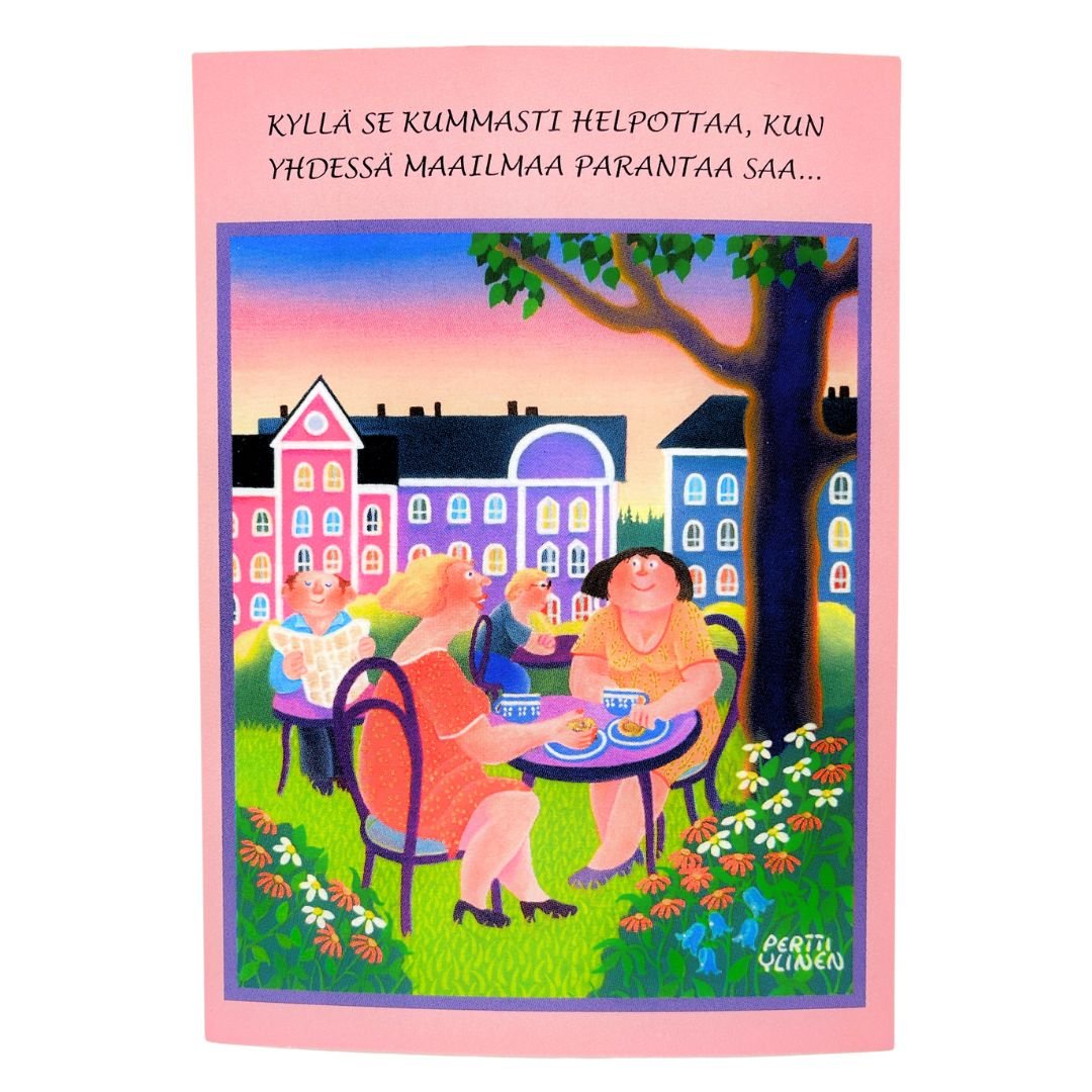 Kotimainen Vilippus-kortti on ihana tervehdys omalle juttukaverille. Taiteilija Pertti Ylinen on luonut kortin veikeän kuvituksen kahvilassa juttelevista naisista. Teksti ”Kyllä se kummasti helpottaa, kun yhdessä maailmaa parantaa saa” piristää ystävän päivää. Lähetä piristävät tervehdykset postikortilla tai anna hauska kortti lahjan kyljessä.