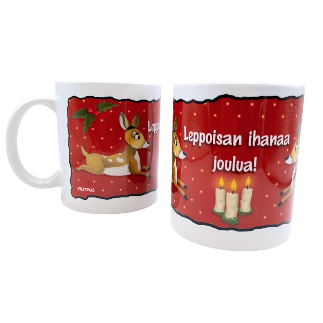 Ihanan peurakuvituksen on luonut taiteilija Pertti Ylinen. Mukin teksti ”Leppoisan ihanaa joulua!” on lämminhenkinen jouluntoivotus.