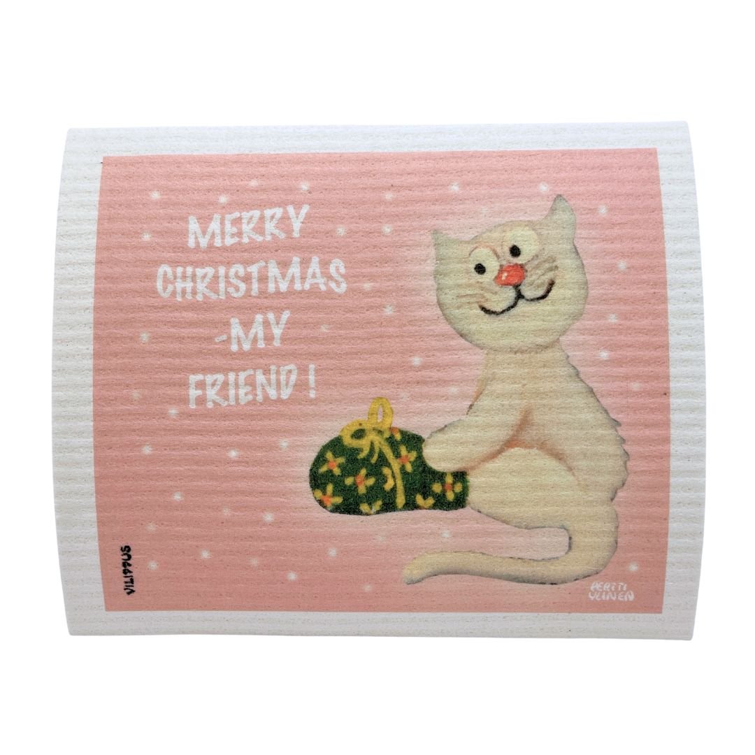 Tiskirätin suloisen kissakuvituksen on luonut taiteilija Pertti Ylinen. Teksti ”Merry Christmas my friend!” sopii kansainvälisiin joulutervehdyksiin.