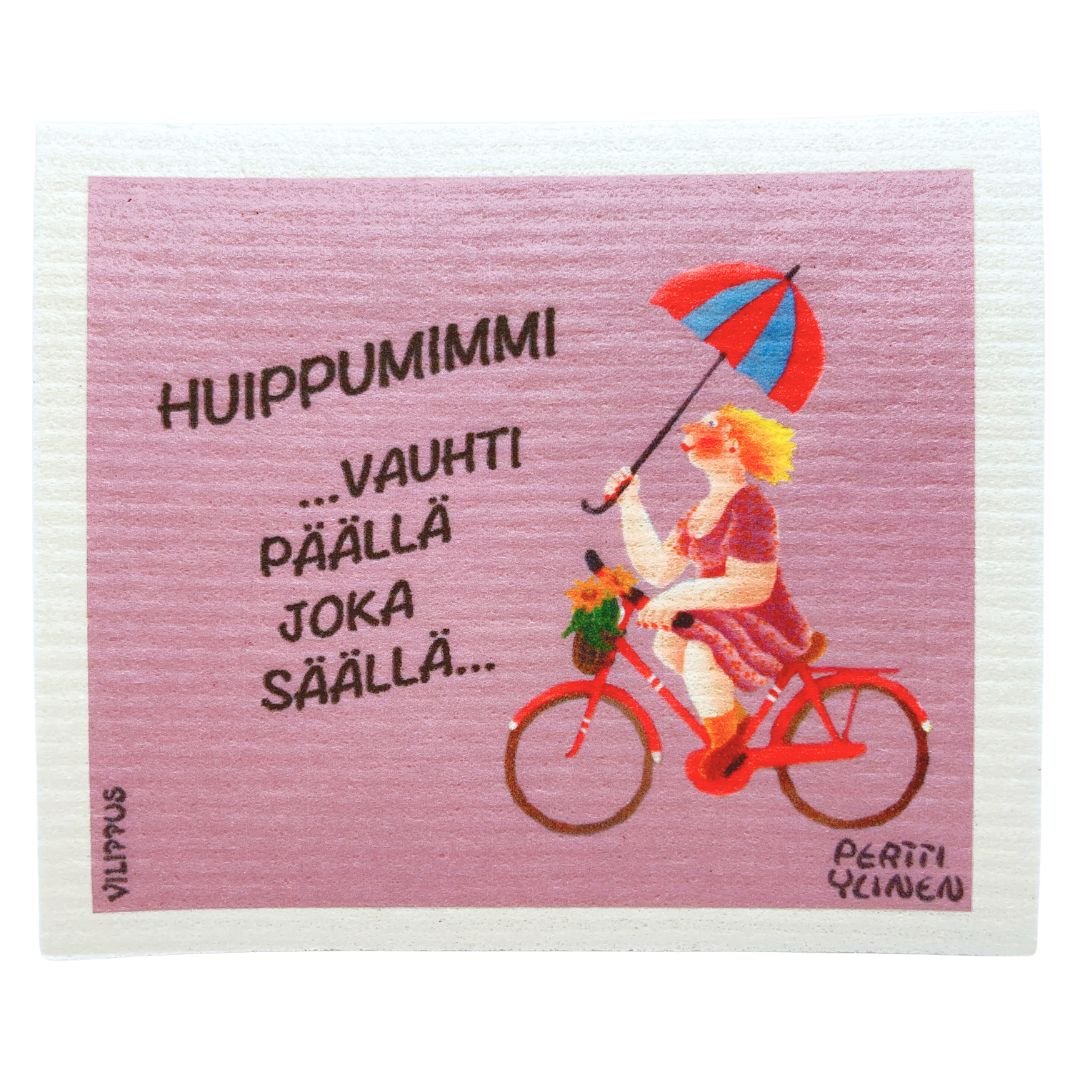 Kotimainen Vilippus-tiskirätti piristää huippumimmin siivoushetkiä. Taiteilija Pertti Ylinen on luonut veikeän kuvituksen pyöräilevästä naisesta. Ilahduta huippumimmiä vauhdikkaalla rätillä! Siivousliina kulkee kätevästi myös postin mukana lahjansaajalle!