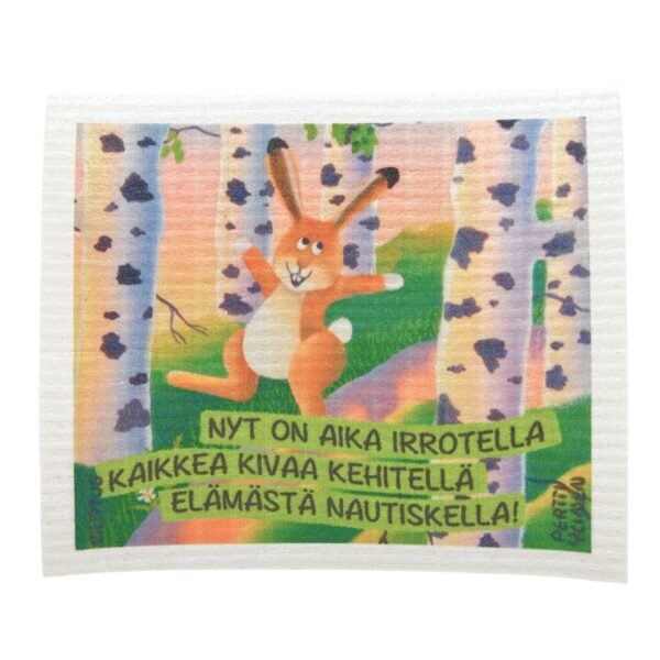 Veikeä kotimainen Vilippus-tiskirätti tuo iloa siivoamiseen itselle tai lahjaksi arjen irrotteluun! Taiteilija Pertti ylinen on luonut siivousliinan hauskan kuvituksen loikkivasta pupusta. Teksti ”Nyt on aika irrotella, kaikkea kivaa kehitellä, elämästä nautiskella!” sopii unelmointiin kannustavaksi tervehdykseksi moneen tilanteeseen niin arkeen kuin juhlaan. Tiskirätti kulkee myös kätevästi postissa tervehdyksenä.