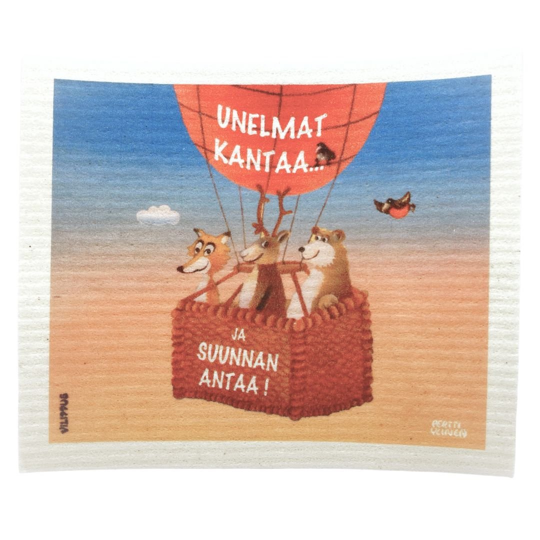 Kotimainen Vilippus-tiskirätti piristää unelmoijan siivoushetkiä. Taiteilija Pertti Ylinen on luonut veikeän kuvituksen kuumailmapallolla lentävistä eläimistä. Ilahduta haaveilijaa suloisella rätillä! Siivousliina kulkee kätevästi myös postin mukana lahjansaajalle!