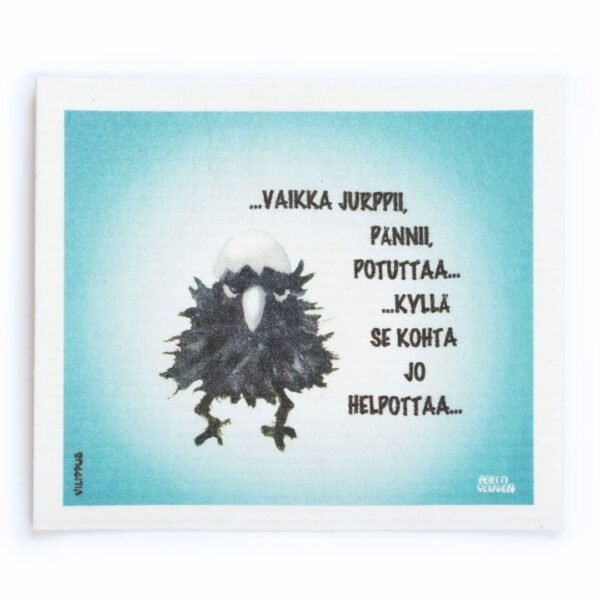 Kotimainen Vilippus-tiskirätti on hauska lahjaidea synkeisiin päiviin. Taiteilija Pertti Ylinen on luonut hauskan kuvituksen ärtyneestä variksenpoikasesta. Teksti ”Vaikka jurppii, pännii, potuttaa, kyllä se kohta jo helpottaa” on hauska tsemppilause. Siivousliina kulkee kätevästi myös postin mukana lahjansaajalle!