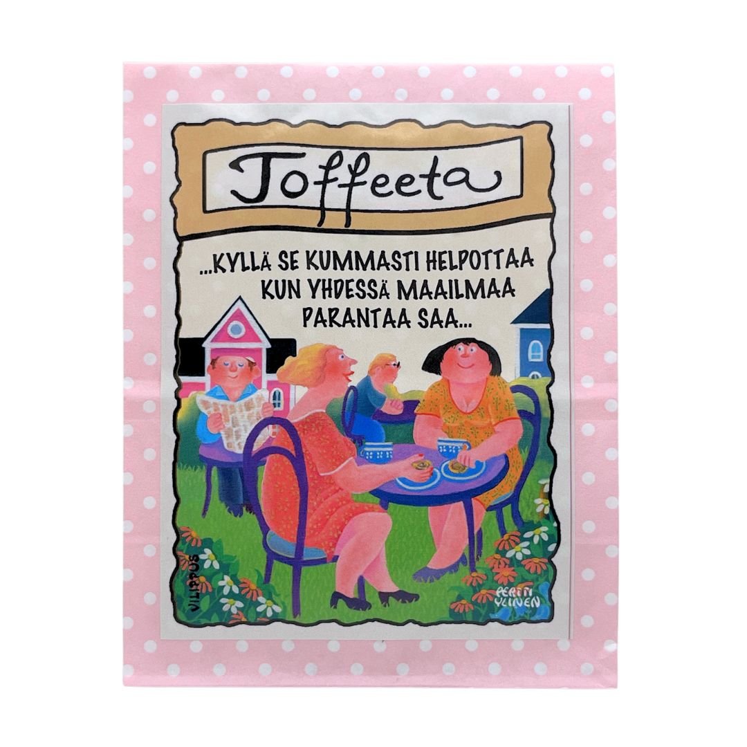 Täyteläinen kermatoffee on veikeä lahja maailmanparantajille! Taiteilija Pertti Ylinen on luonut pussin hauskan kuvituksen kahvipöydän ääressä juttelevista naisista. Kerro juttukaverille kuinka tärkeitä yhteiset hetket ovat tekstillä ”Kyllä se kummasti helpottaa, kun yhdessä maailmaa parantaa saa”! Makea kermatoffee on hauska lahja, taikka ilahdutus omiin herkkuhetkiin.