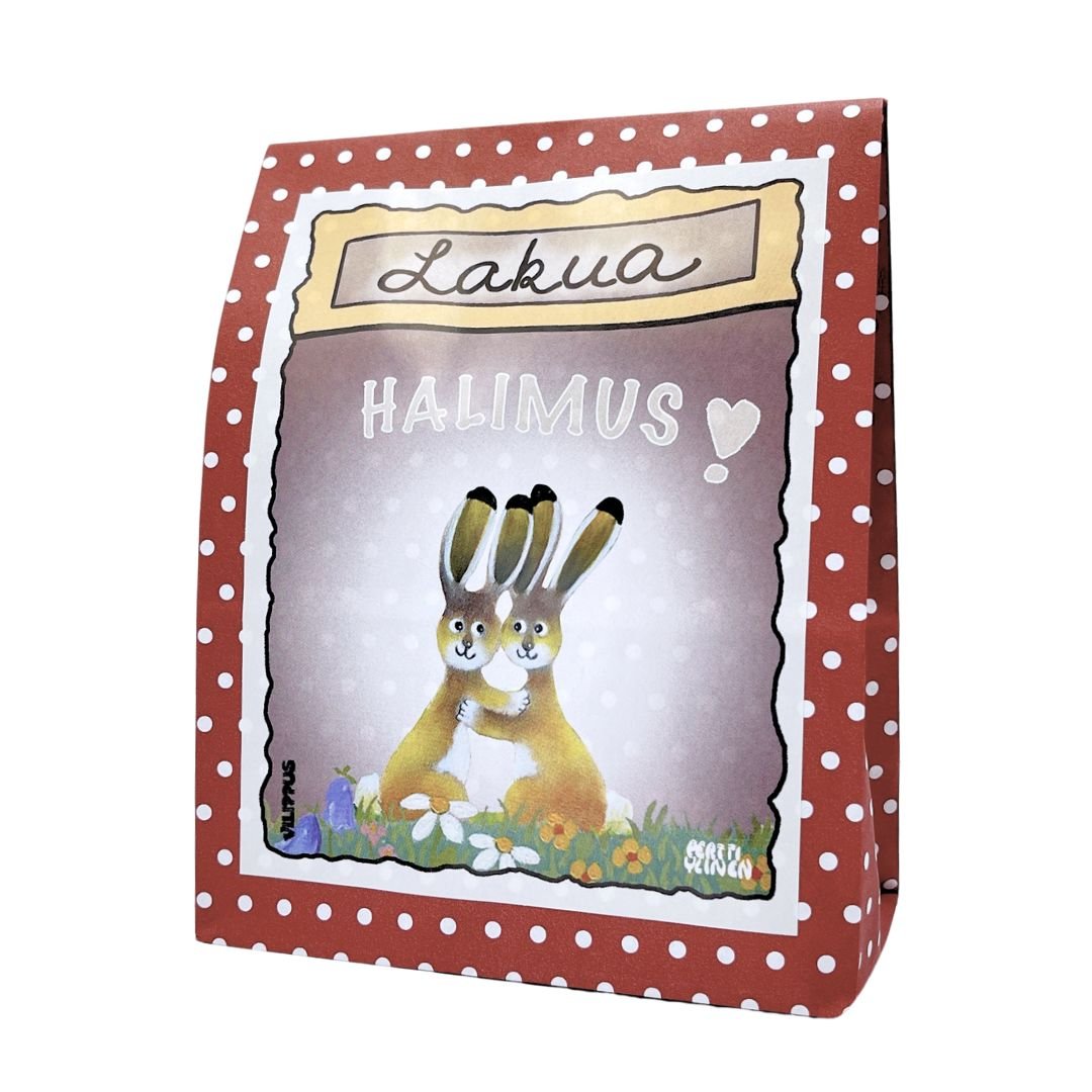 Kotimainen Vilippus-lakritsi on suloinen lahja halikaverille! Taiteilija Pertti Ylinen on luonut pussin suloisen pupukuvituksen. Pussissa lukeva ”Halimus!” on söpö lausahdus omalle kullalle. Halipulaan sopiva laku on Suomessa valmistettu. Suussasulava kotimainen laku on makea lahja sellaisenaan tai osana lahjakokonaisuutta.