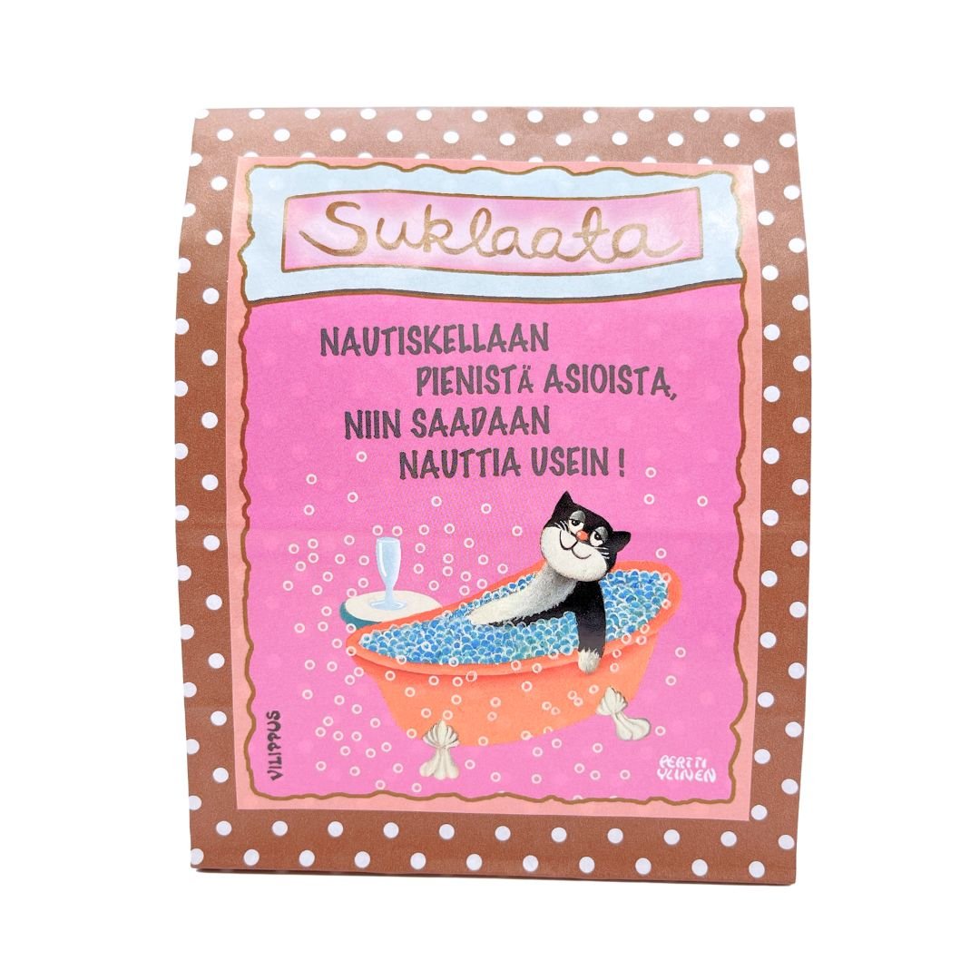 Taiteilija Pertti Ylinen on luonut pussin hauskan kuvituksen rentoutuvasta kissasta. Teksti ”Nautiskellaan pienistä asioista, niin saadaan nauttia usein!” muistuttaa nautiskelemaan myös arjen keskellä. Veikeä suklaapussi piristää vaikkapa omaa arkea, ja on ihana vieminen tai lahja sellaisenaan tai osana isompaa kokonaisuutta.
