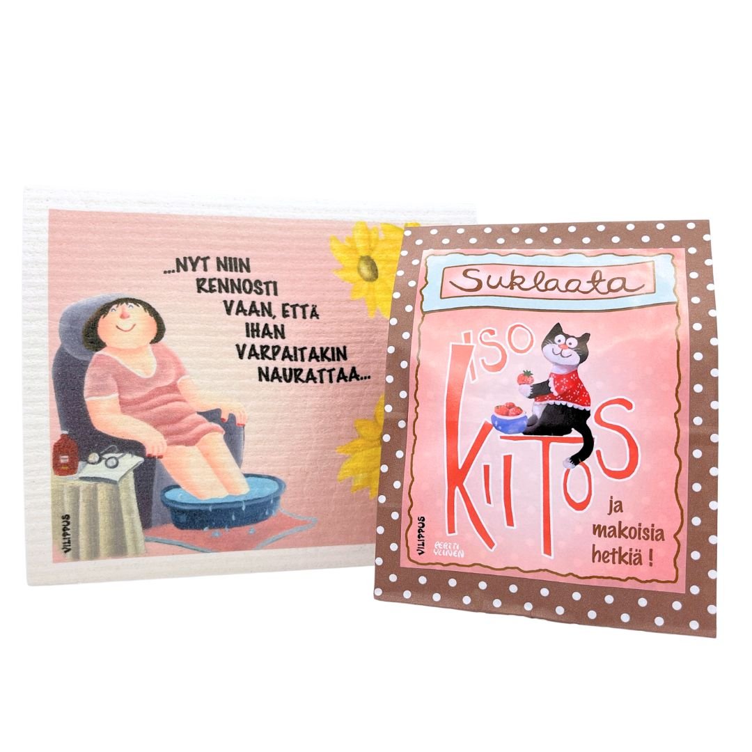 Hauska Vilippus-kiitoslahja on kaunis tapa kiittää opettajaa, hoitajaa tai valmentajaa kauden lopussa. Rennot kiitokset -lahjasetti sisältää Iso kiitos ja makoisia hetkiä! -suklaan, sekä Nyt niin rennosti vaan, että ihan varpaitakin naurattaa -tiskirätin.
