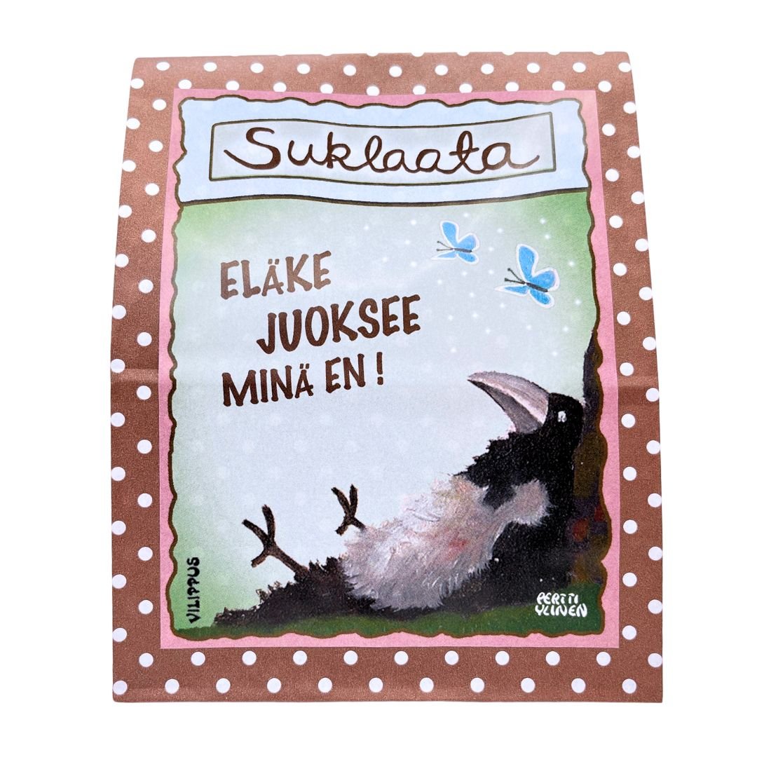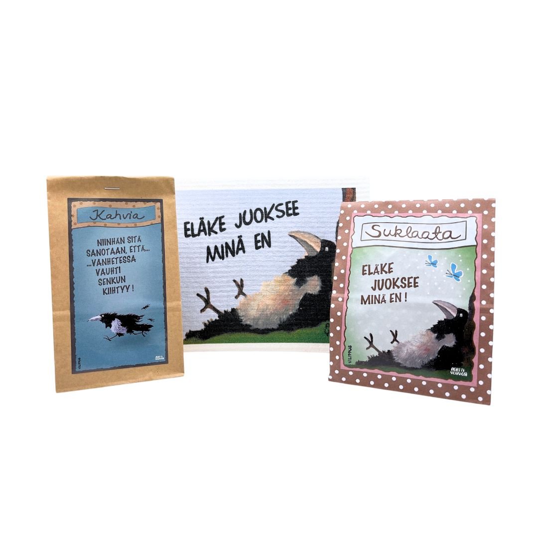 Taiteilija Pertti Ylinen on luonut pussin rennon kuvituksen loikoilevasta variksesta. Teksti ”Eläke juoksee minä en!” toivottelee rentoja eläkepäiviä.