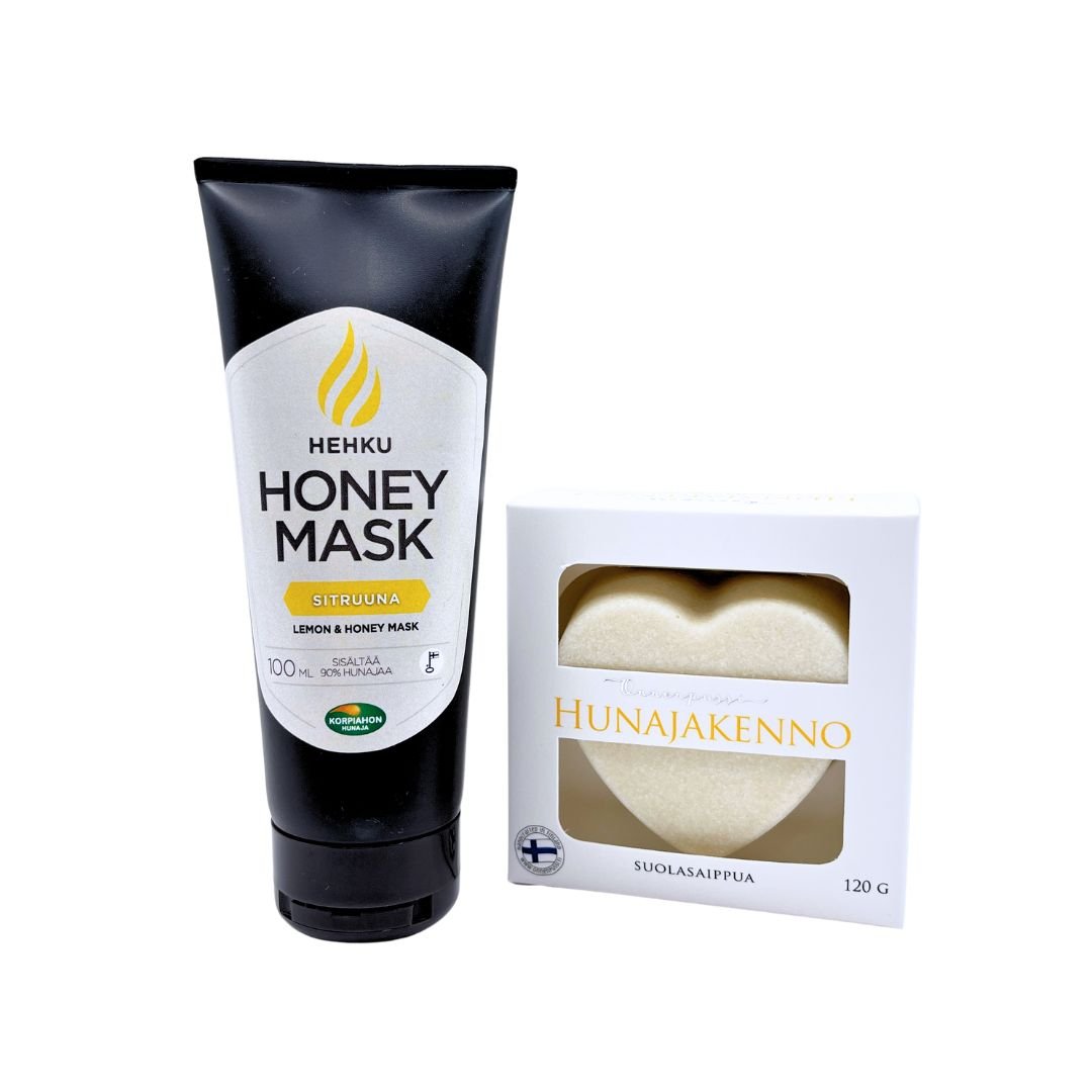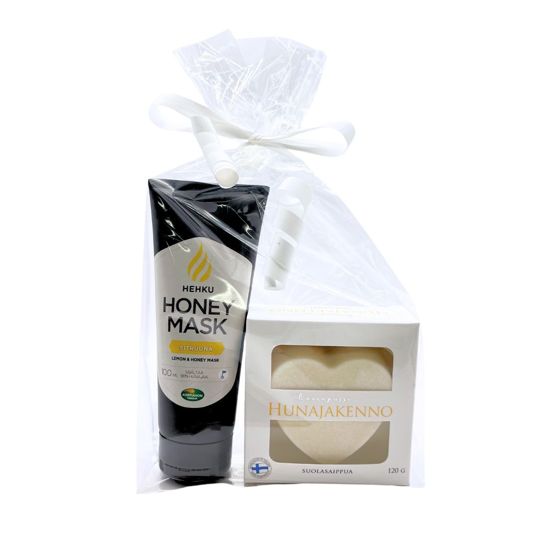 Valmis lahjapaketti tuo rauhaisan mielen mökille hunajaisin tuoksuin! Hellivä setti koostuu kotimaisista pienyritysten tuotteista. Hunajainen mökkisauna -settiin sisältyy ihoa hellivä hunajaa ja mehiläisvahaa sisältävä Onnenpussi-suolasaippua ja Korpiahon Hunajan sitruuna-honey mask.