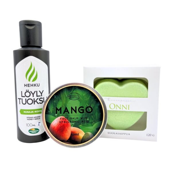 Valmis lahjapaketti tuo rennon mielen mökille makein tuoksuin! Hellivä setti koostuu kotimaisista pienyritysten tuotteista. Makea mökkisauna -settiin sisältyy ihoa raikkaan sitruksisen tuoksuinen Onnenpussi-suolasaippua, Korpiahon Hunajan koivulta ja hunajalta tuoksuva löylytuoksu ja Taponeron mango-kasvovoide.