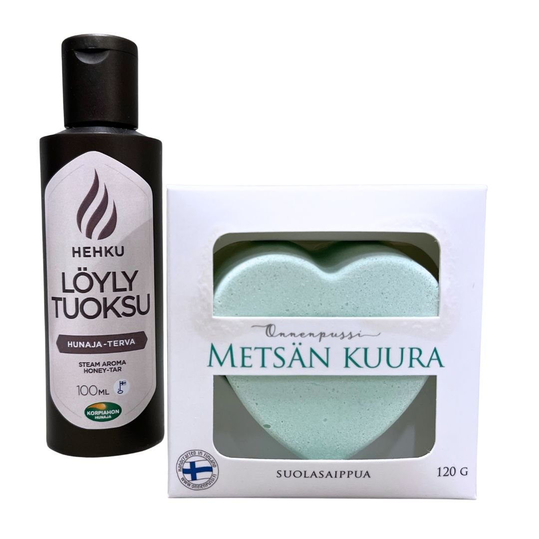 Metsän tuoksut -settiin sisältyy kevyen maskuliinisen tuoksuinen Onnenpussi-suolasaippua ja Korpiahon Hunajan tervalta ja hunajalta tuoksuva löylytuoksu. Suolasaippua sopii koko vartalon pesuun, sekä neutraloi hienhajua.